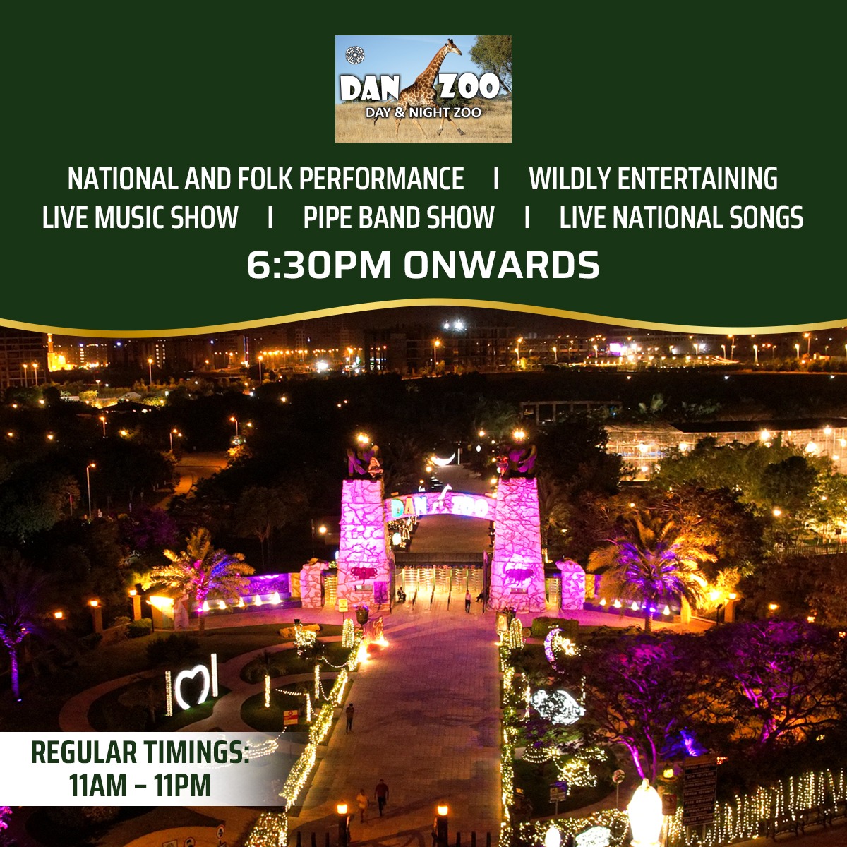 DanZoo at 6:30 pm, where the stage will come alive with the harmonious tunes of national and folk performances. Be prepared to be enchanted by a lively pipe band show and the resonating chords of live national songs, creating an atmosphere of unity and pride. As the sun dips below the horizon, the tempo rises with an electrifying live music show that will leave you exhilarated.
