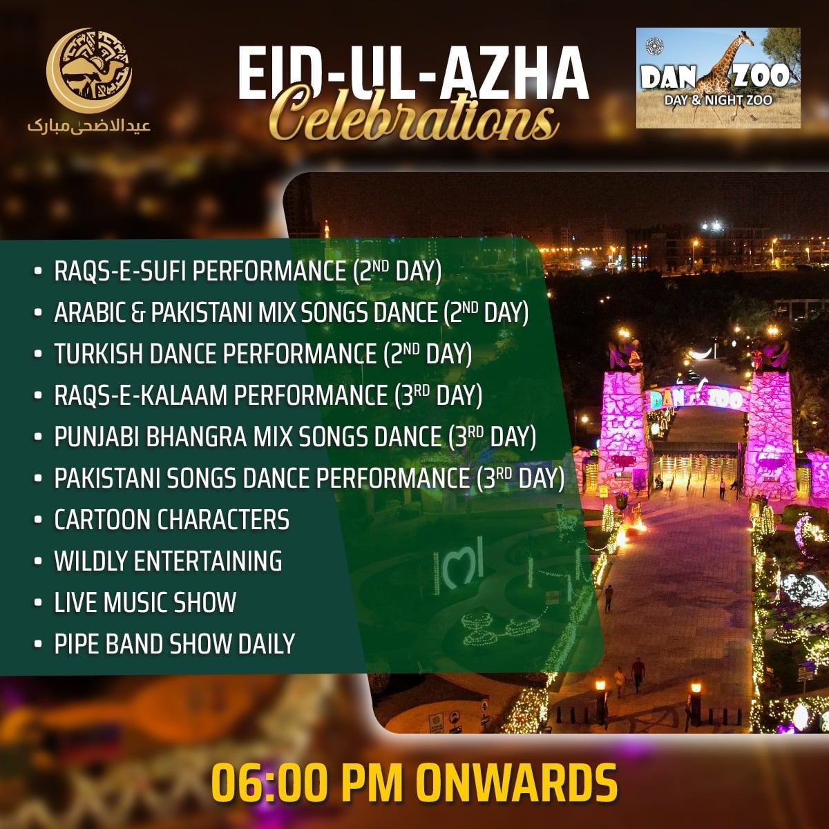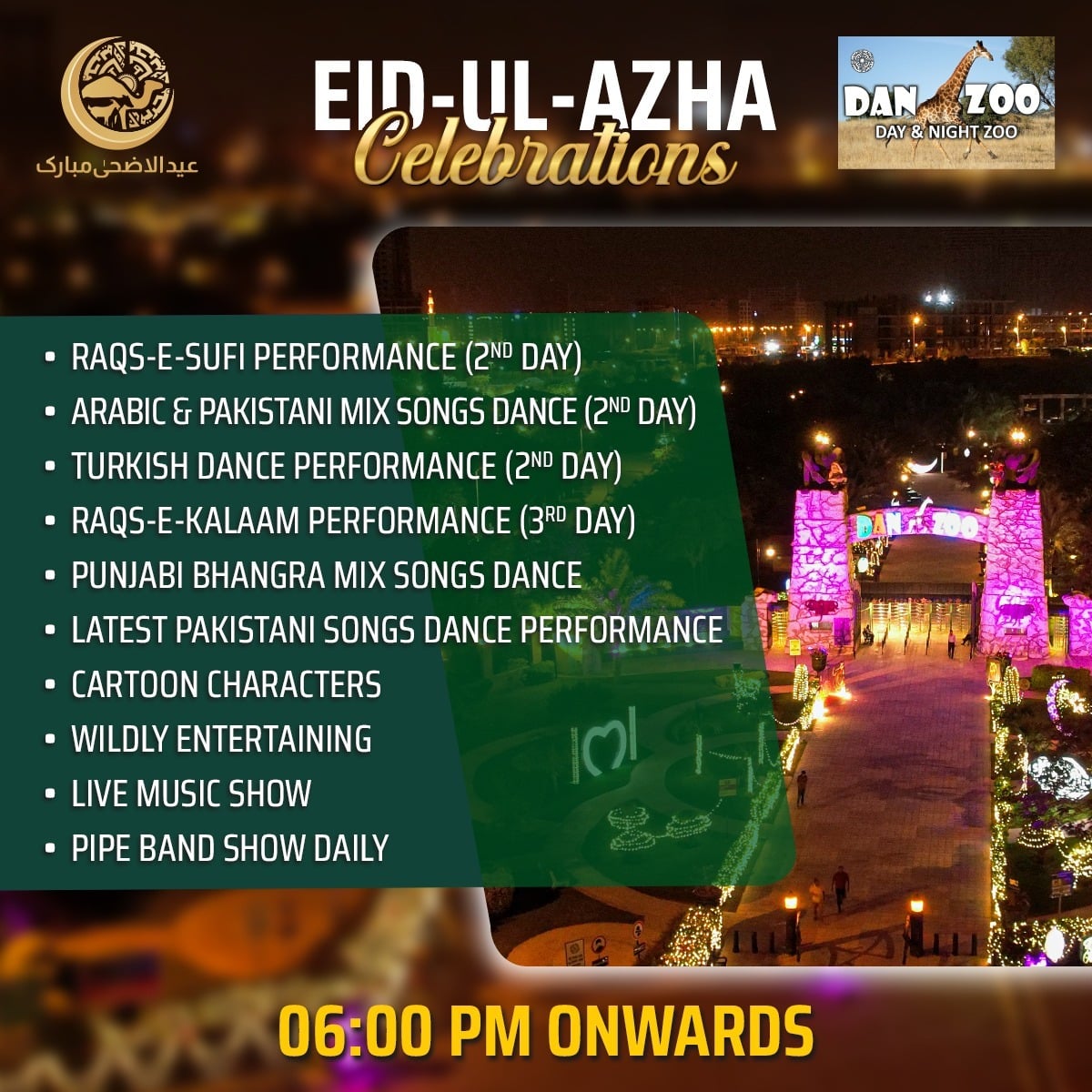 At DanZoo (Day and Night Zoo), the second day of Eid will come alive with captivating performances, beginning with the enchanting Raqs-e-Sufi. Visitors will be treated to an exhilarating blend of Arabic and Pakistani songs, Turkish dance performances, and more. The third day will see the soulful Raqs-e-Kalam and vibrant Punjabi Bhangra mix songs and dance. Families can also enjoy the presence of beloved cartoon characters, wildly entertaining activities, live music, and daily pipe band shows.