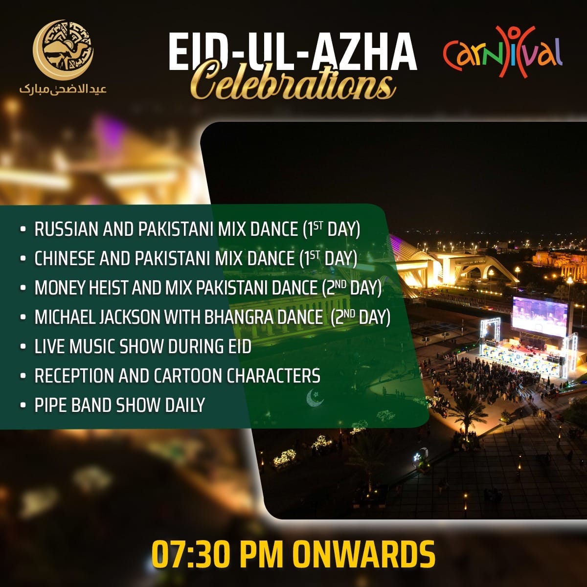 The Carnival will kick off on the first day of Eid with an exciting mix of Russian and Pakistani dances, followed by Chinese and Pakistani fusion performances. The second day will bring even more excitement with Money Heist-themed and Pakistani mix dances, as well as a unique blend of Michael Jackson and Bhangra dance. Throughout Eid, guests can enjoy live music shows, receptions, cartoon characters, and daily pipe band shows.